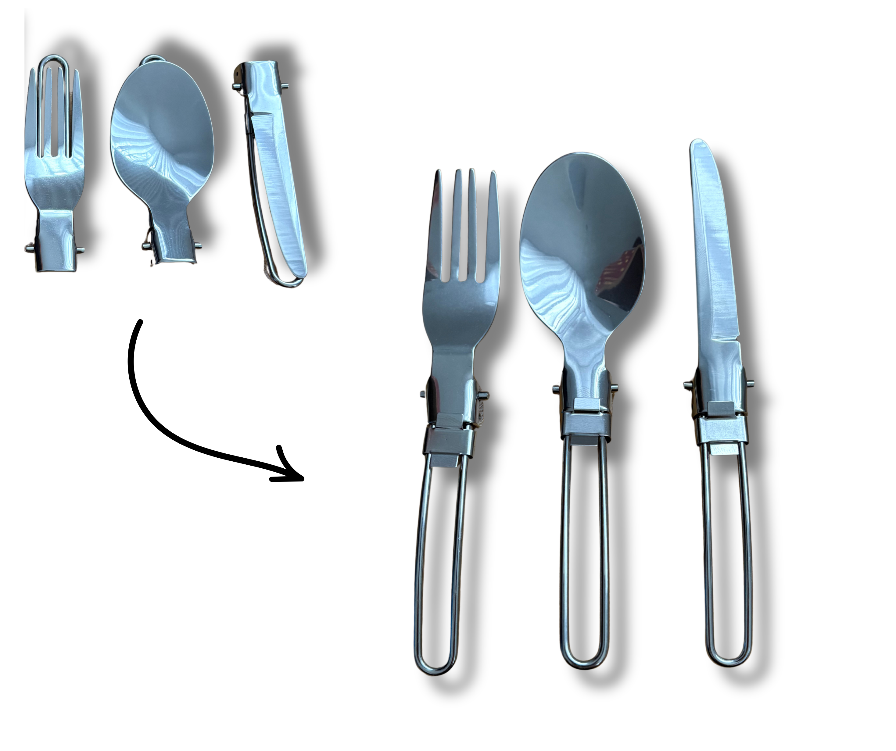 Das Besteck lässt sich einfach zusammenklappen und sicher in der mitgelieferten Tasche verstauen. So bleibt alles sauber, geschützt und jederzeit einsatzbereit – egal ob beim Kochen im Van, beim Picknick oder auf Reisen.