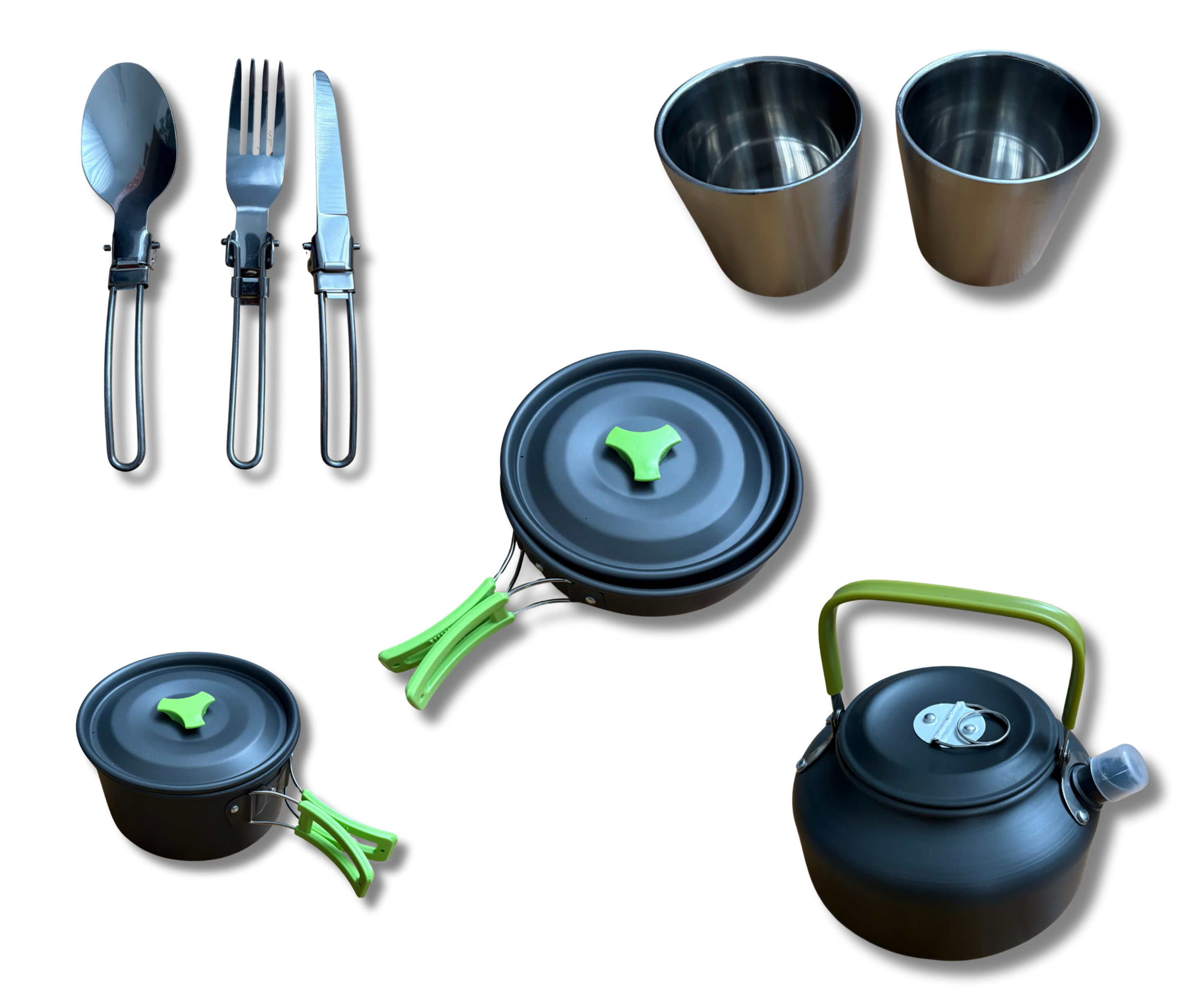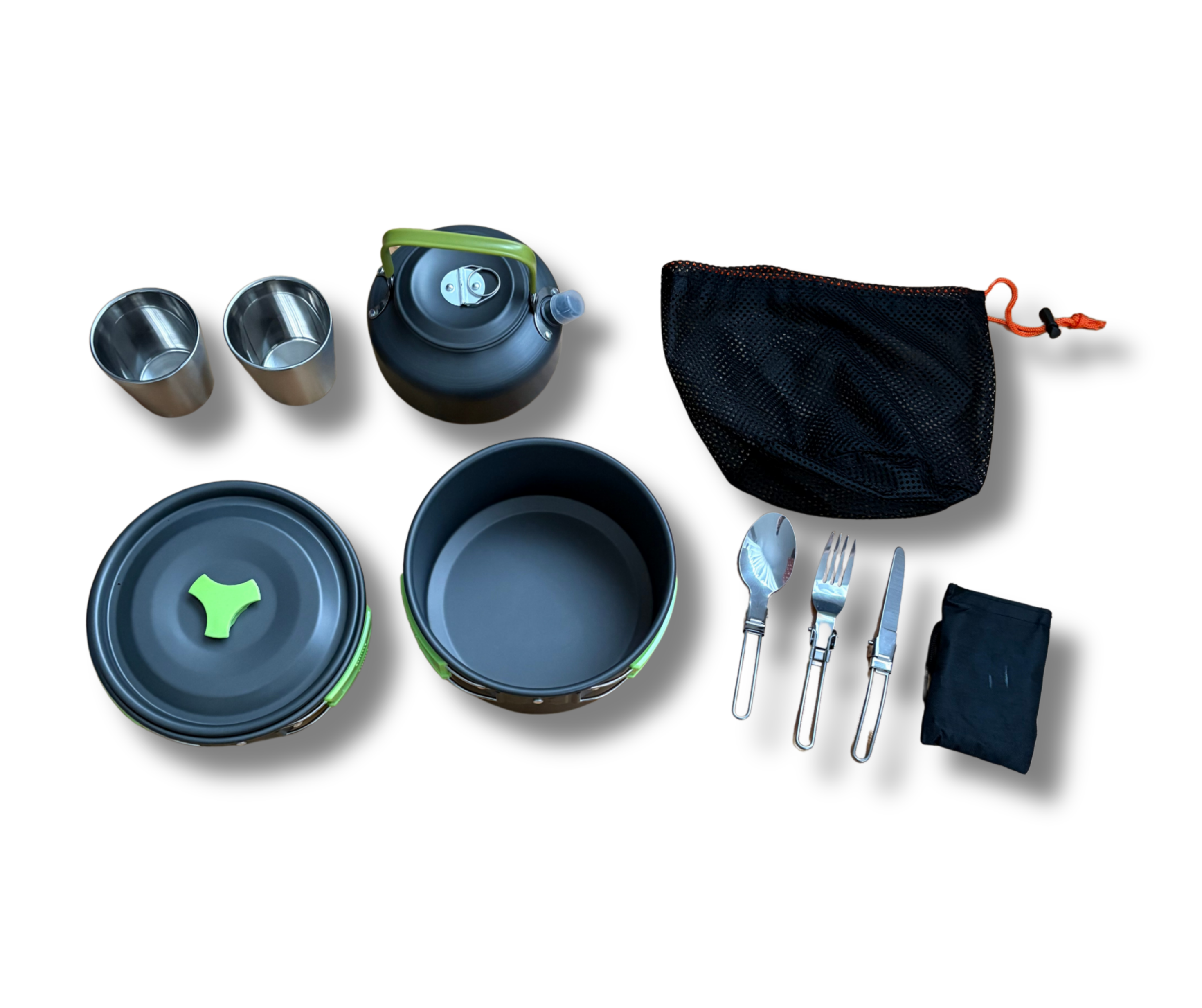Dieses kompakte Camping-Kochset bietet dir alles, was du für das Kochen unterwegs brauchst – übersichtlich verstaut und platzsparend verpackt. Perfekt für Camper, Vanlife, Roadtrips und Outdoor-Abenteuer, bei denen Funktionalität und geringer Stauraum entscheidend sind.